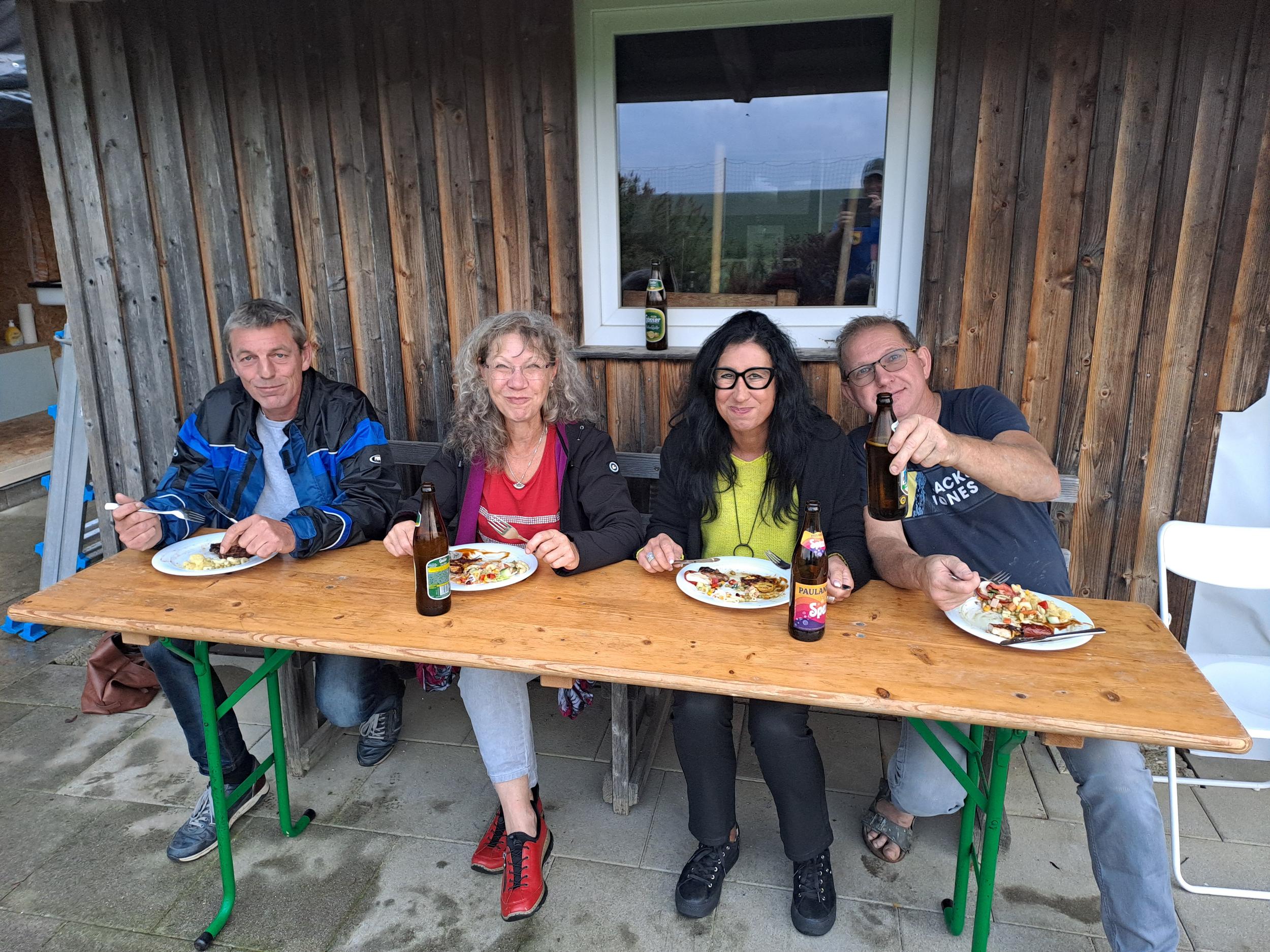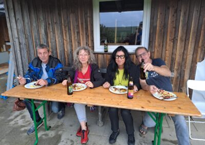 Der Stimmung tat das Wetter keinen Abbruch, mittags bestens versorgt mit Leberkäs und Kartoffelsalat, nachmittags mit wunderbaren Torten und Kaffee, machten wir es uns in unserer Hütte gemütlich und die Geselligkeit wurde bei vielen Gesprächen gepflegt.